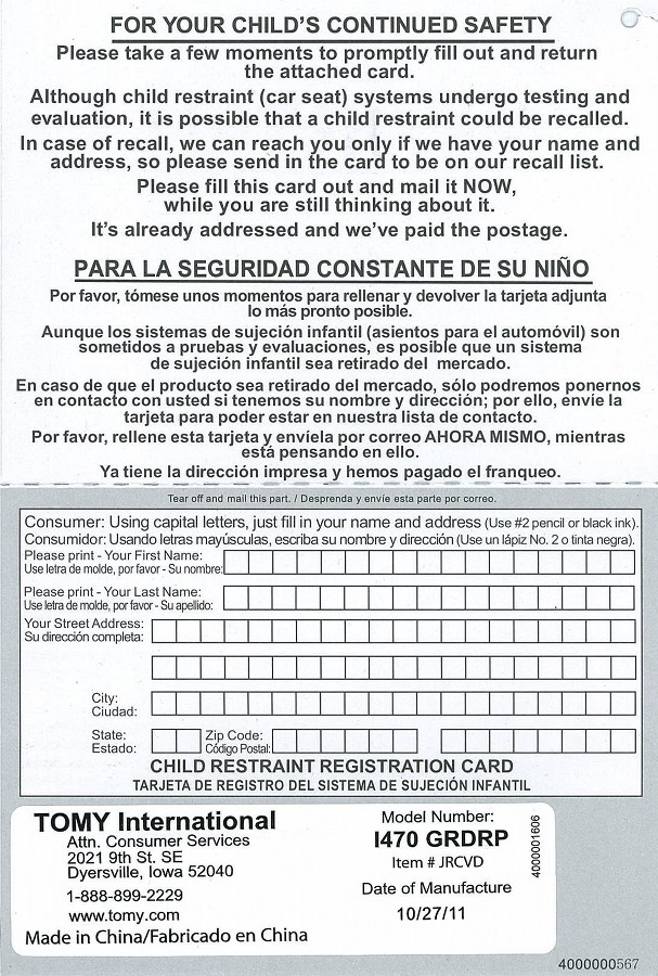 Although child restraint systems undergo testing and evaluation, it is possible that a child restraint could be recalled. In case of a recall, we can reach you only if we have your name and address, so please fill in the registration form to be on our recall list. In order to properly register your child restraint system, you will need to provide the model number, serial number and date of manufacture. This information is printed on the registration card and can also be found on a white label located on the back of the child restraint system. This registration is only applicable to child restraint systems purchased in the United States.